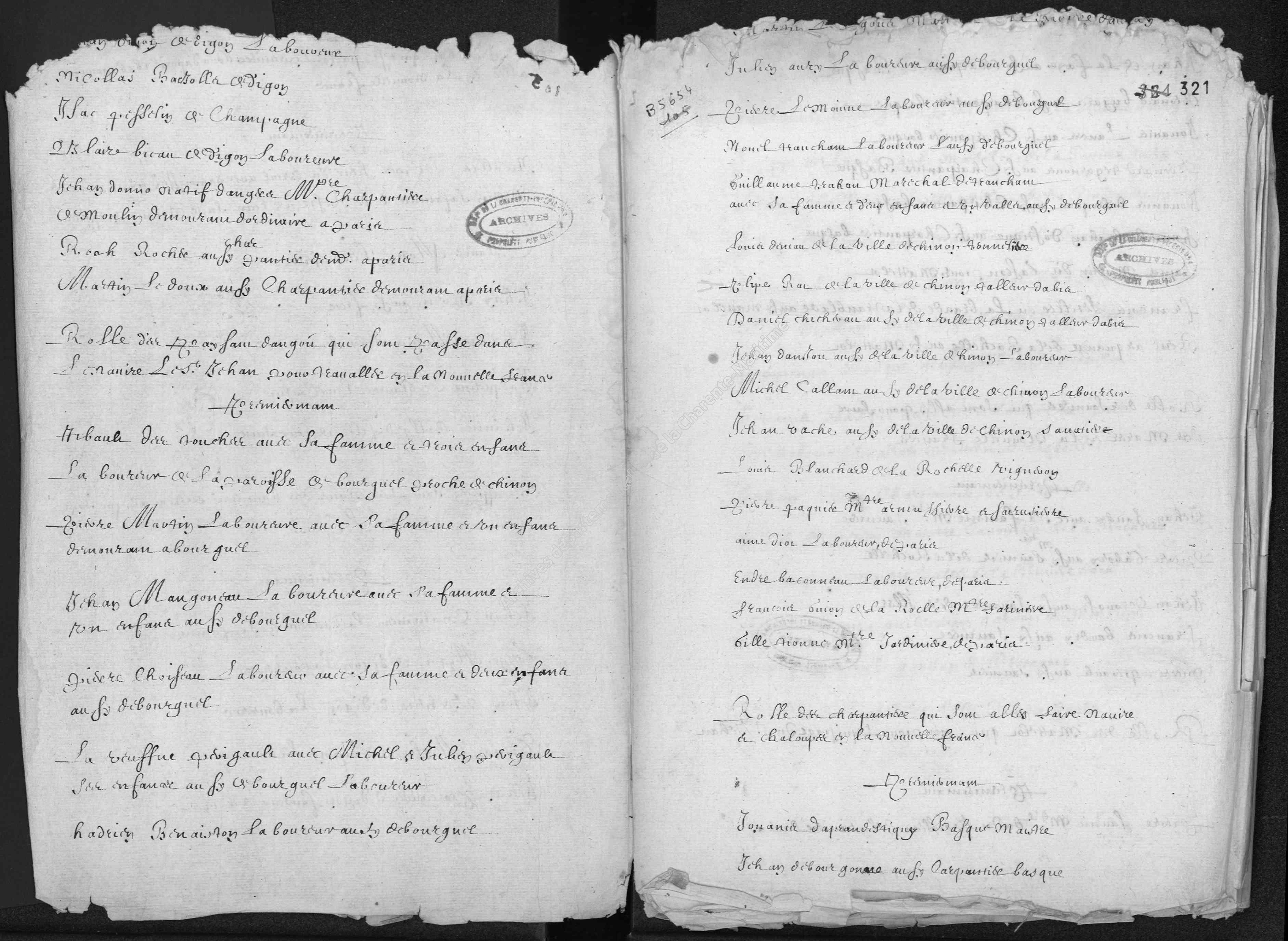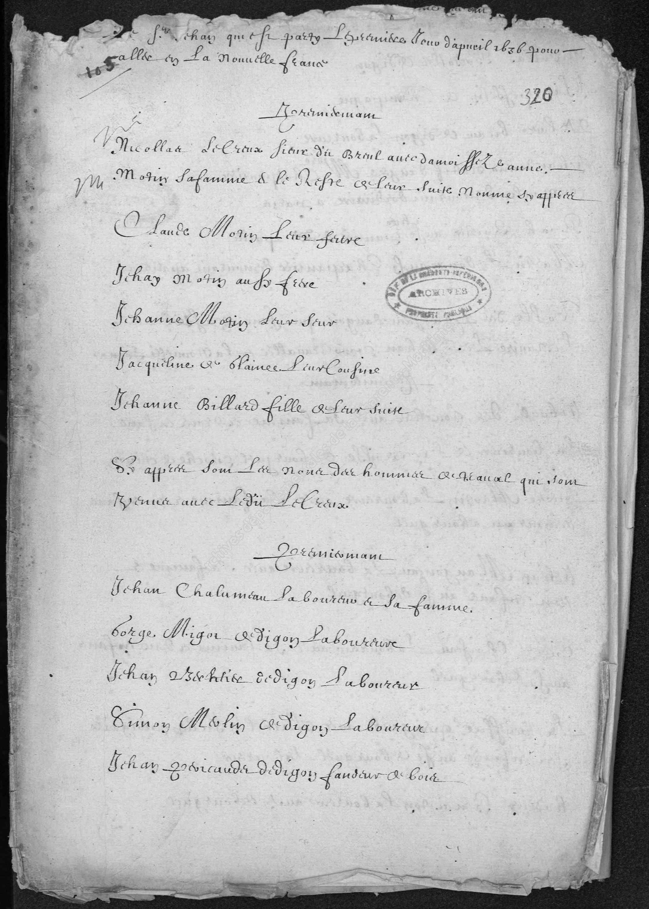 A transcript of the St. Jehan passenger list can be found here. The original list is below, and is found at the French Archives of La Charente Maritime (under "Rôles d'équipage" in lower left; direct link).