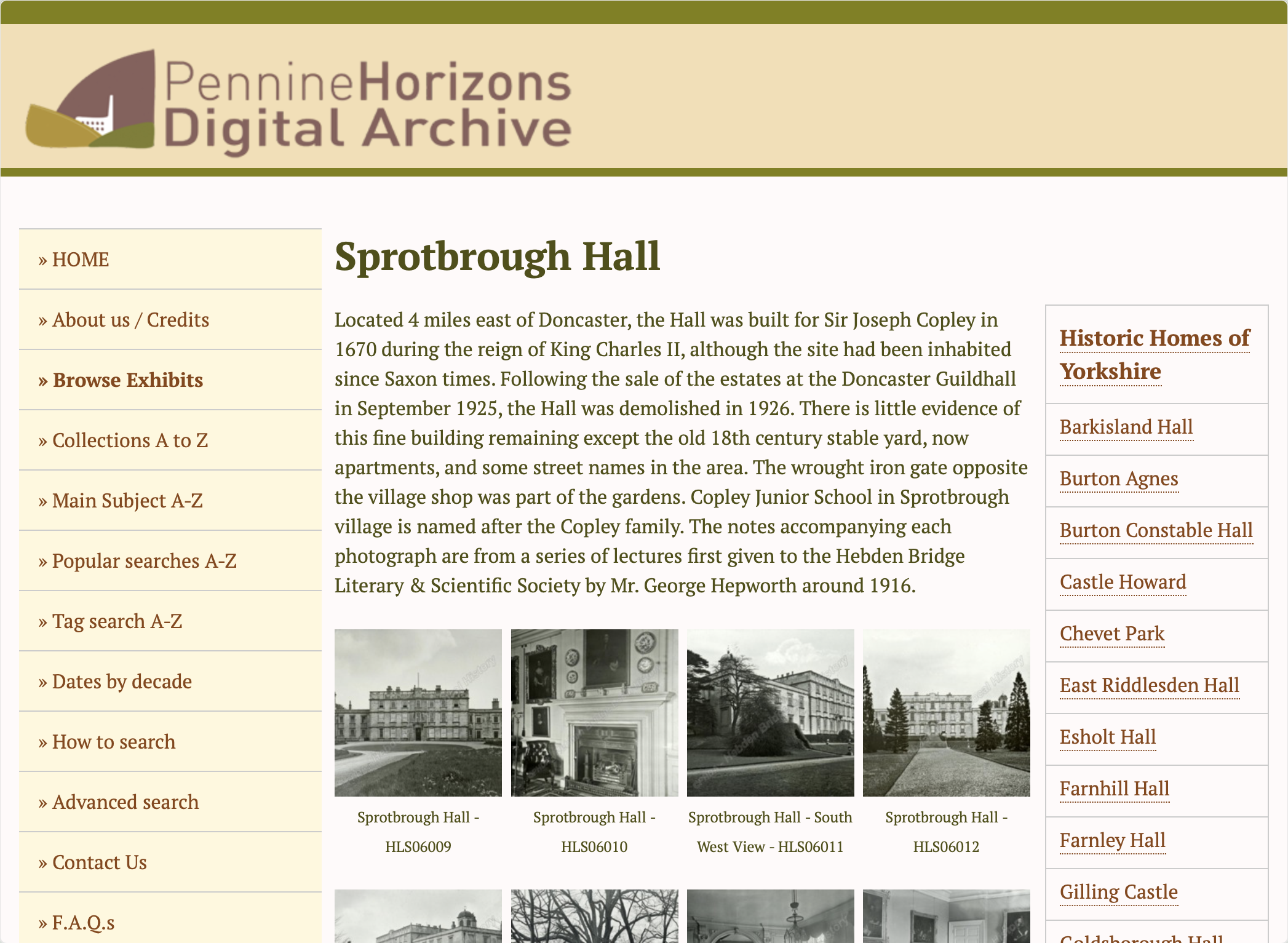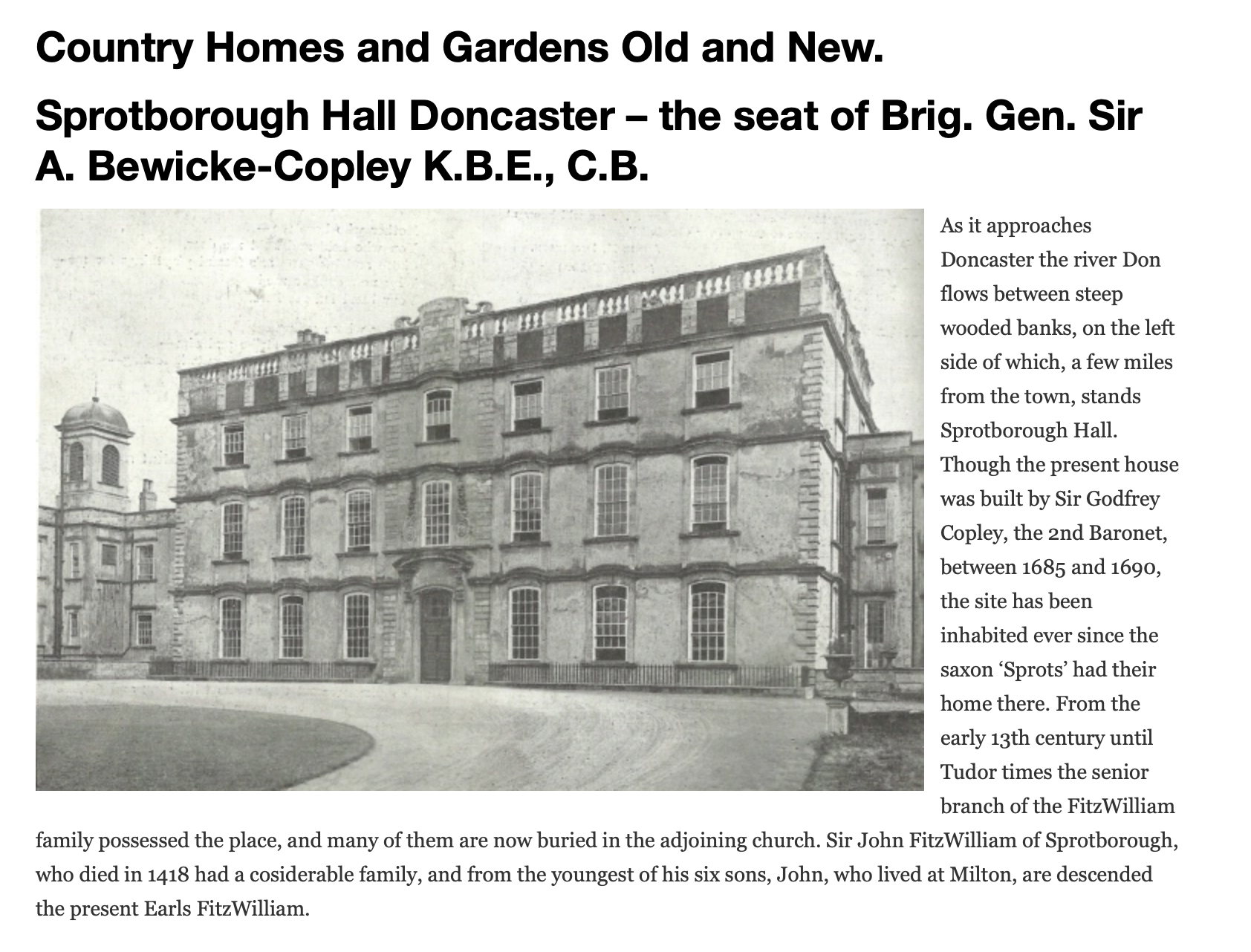 Sprotbrough Hall, South Yorkshire, unknown artist Cusworth Hall Museum and Park (Source) "Sprotborough Hall near Doncaster was built for Sir Godfrey Copley, who was a scientist between 1696 and 1700. The wings of the Hall were added shortly after. The layout of the house is said to have reflected the Palace of Versailles. The house is set in extensive gardens which were laid out in the Dutch style. The hall was demolished in 1926 and the parkland used for a housing estate."