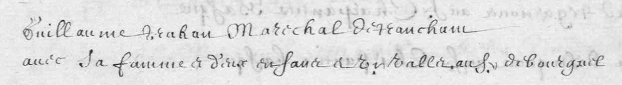 Guillaume Trahan is listed in the St. Jehan passenger list bound for Acadia on 1 April 1636; "avec sa femme et deux enfants et un valet" ("Guillaume Trahan, an edge-tool maker, with his wife and two children, and a valet, also from Bourgeuil").